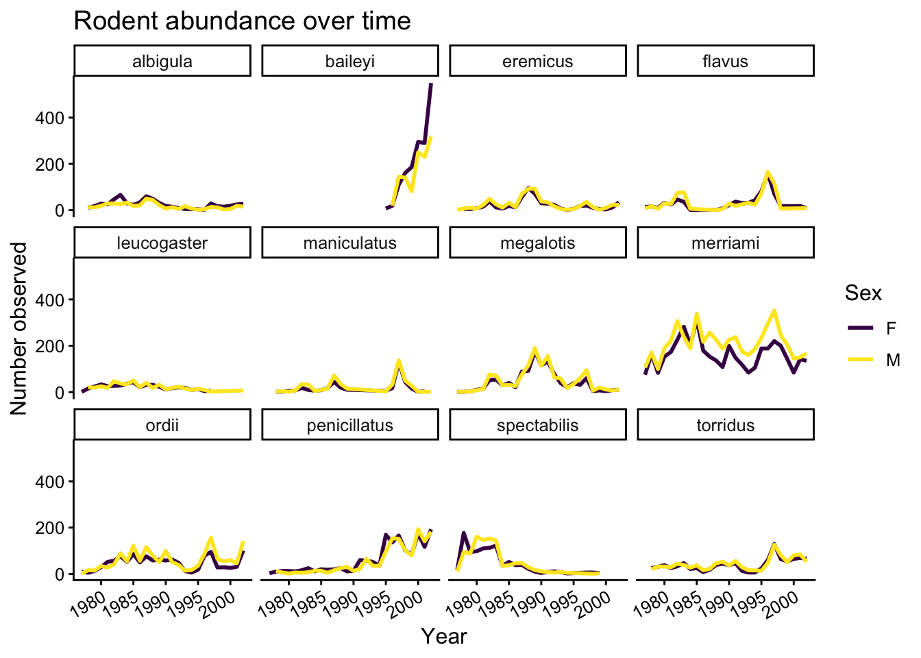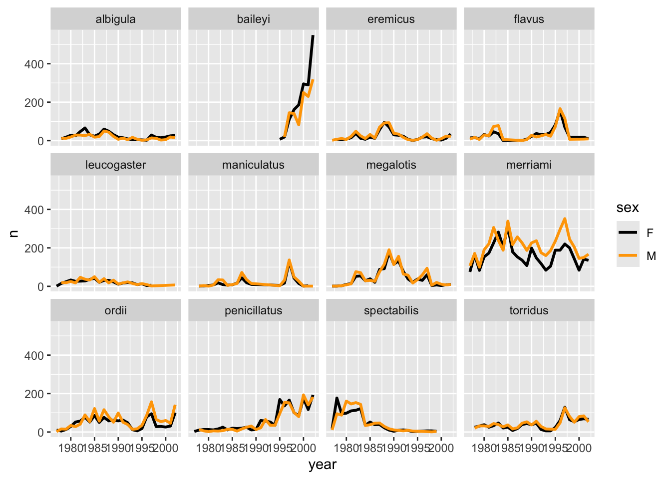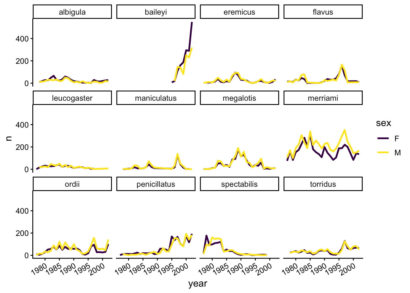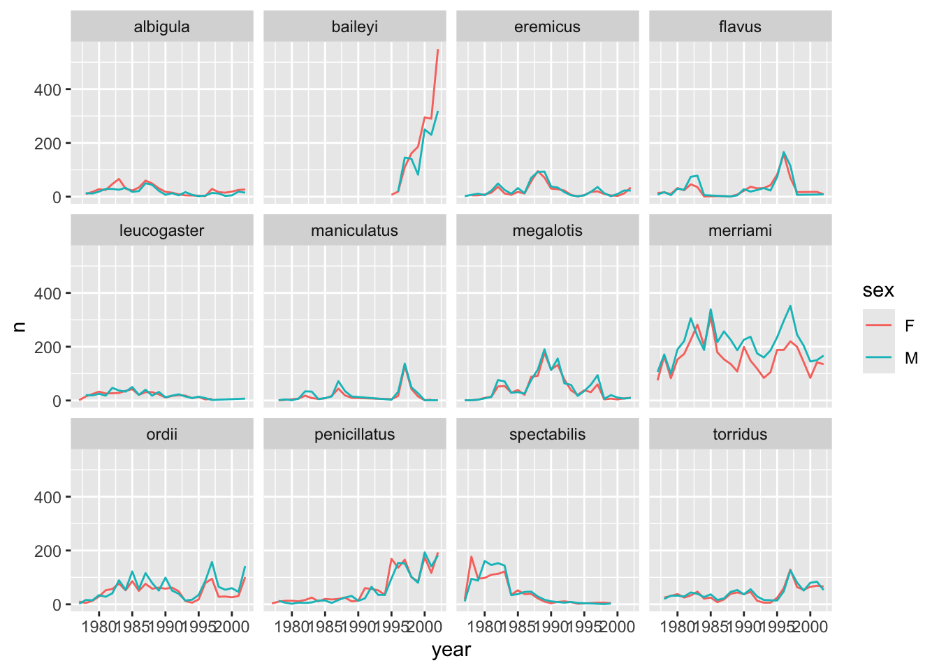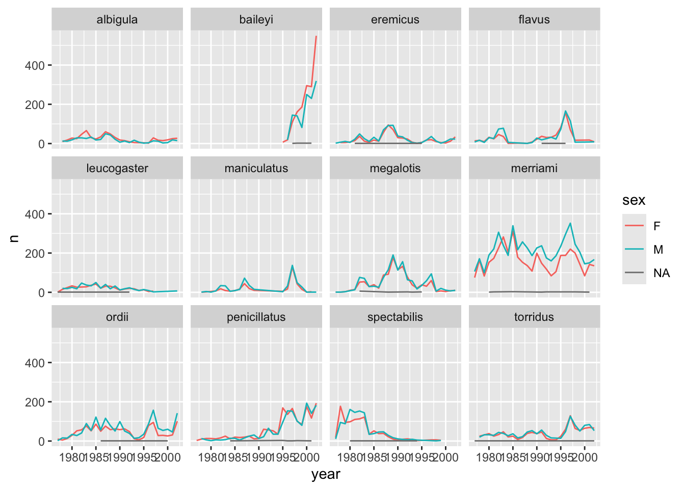 Now we would like to split the line in each plot by the sex of each individual measured. To do that we need to make counts in the data frame after grouping by year, species, and sex: