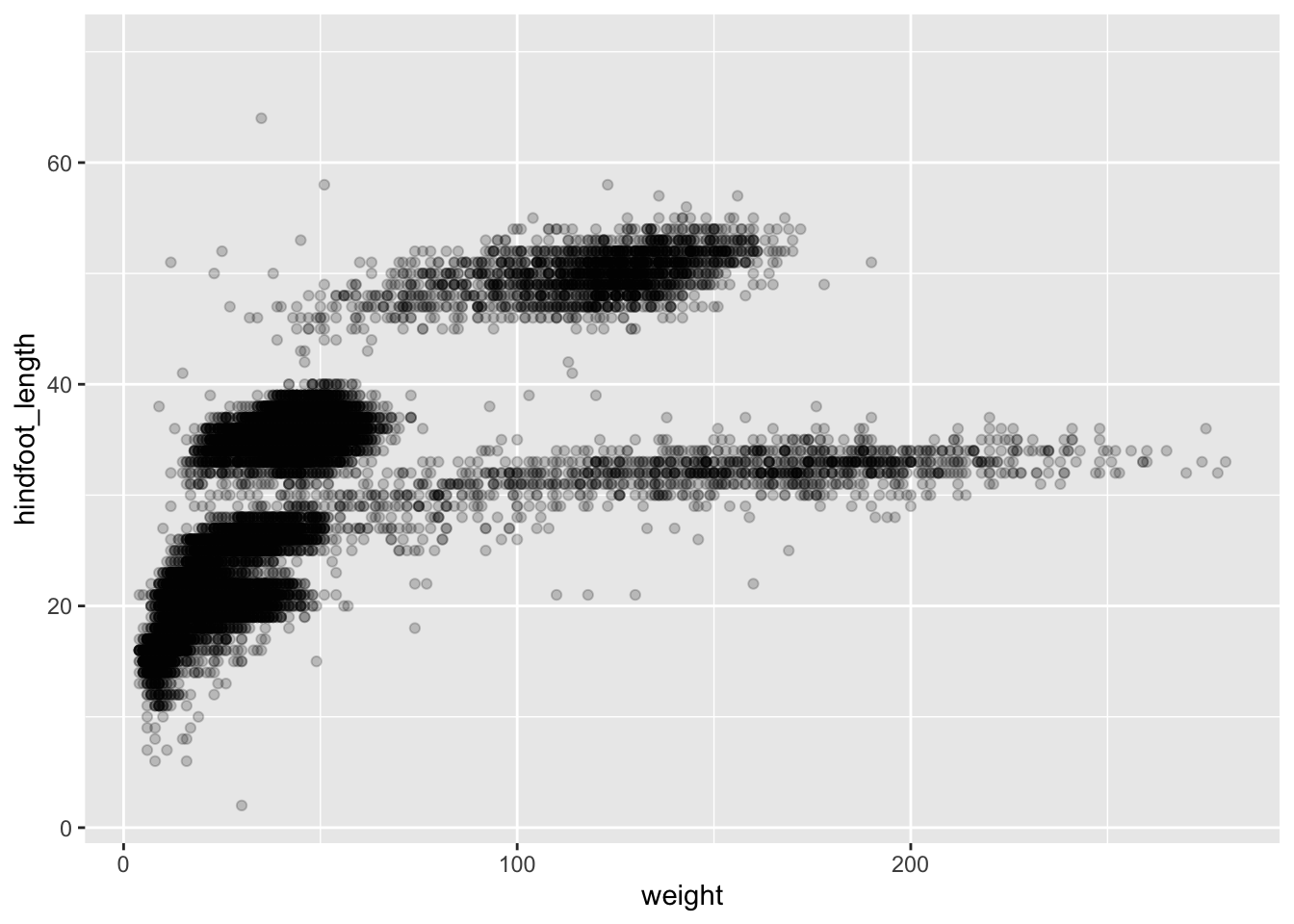 ggplot(surveys, aes(x = weight, y = hindfoot_length)) +
