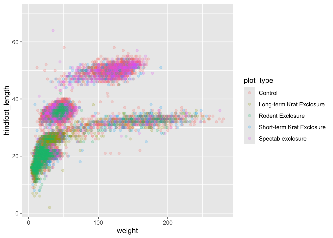 ggplot(surveys, aes(x = weight, y = hindfoot_length, colour = plot_type)) +