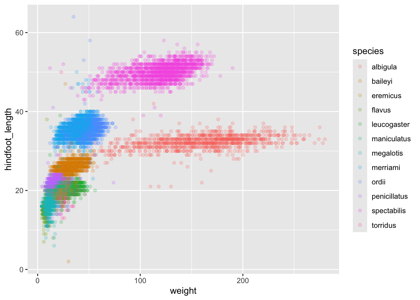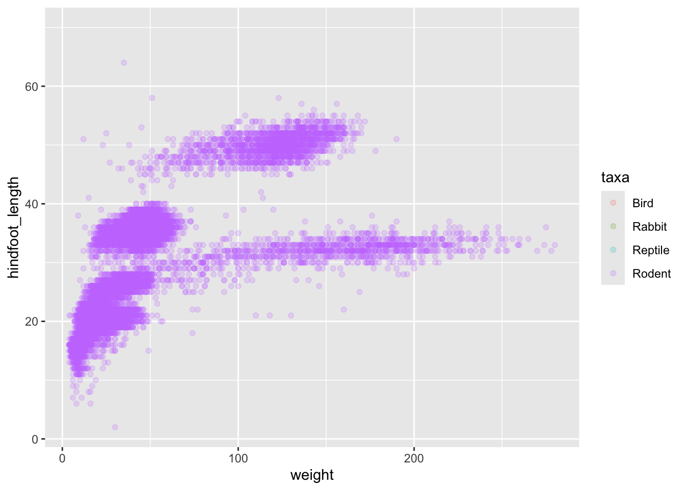 To add a geom to the plot use + operator. Because we have two continuous variables (weight and hindfoot_length), let’s use geom_point() first: