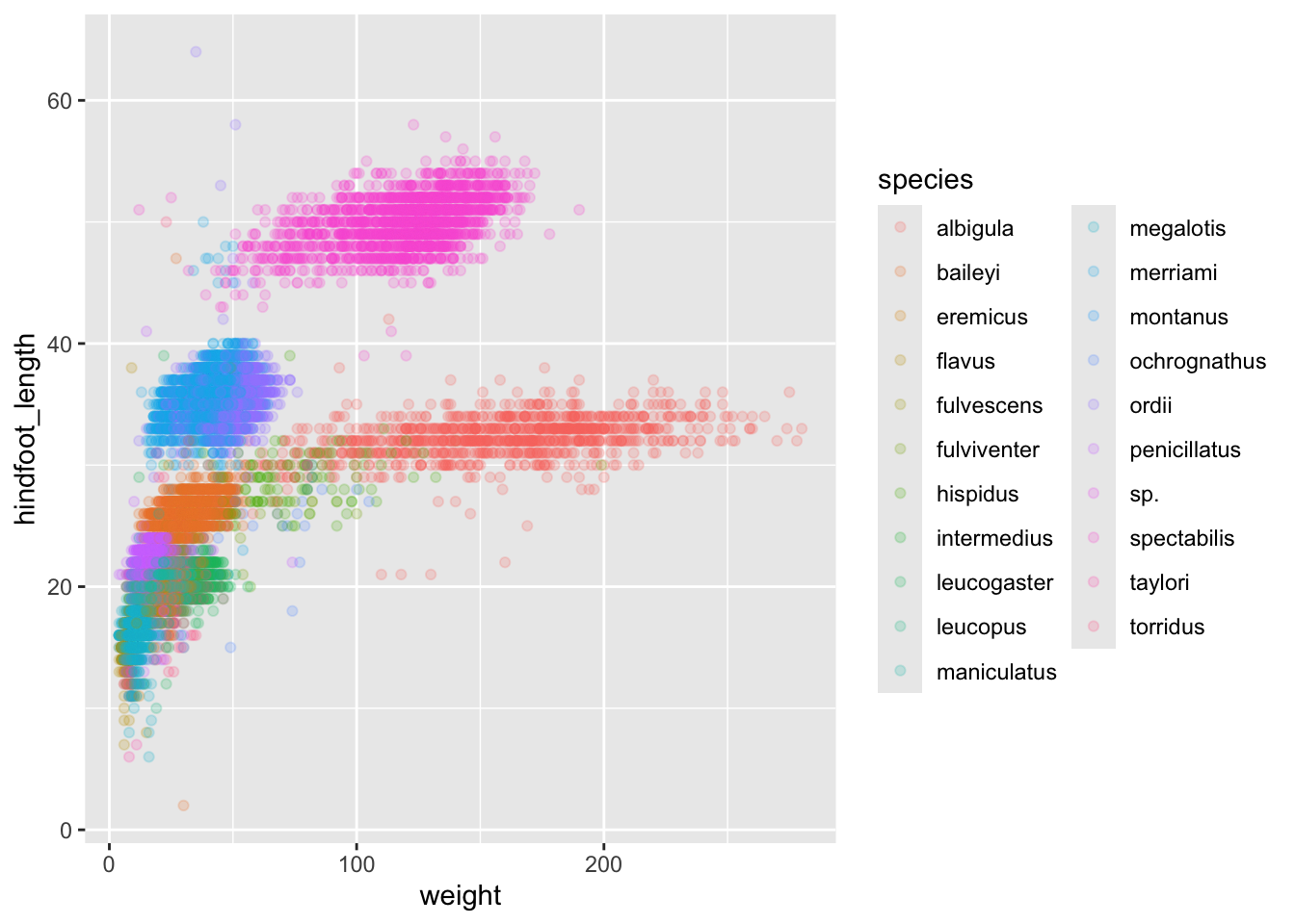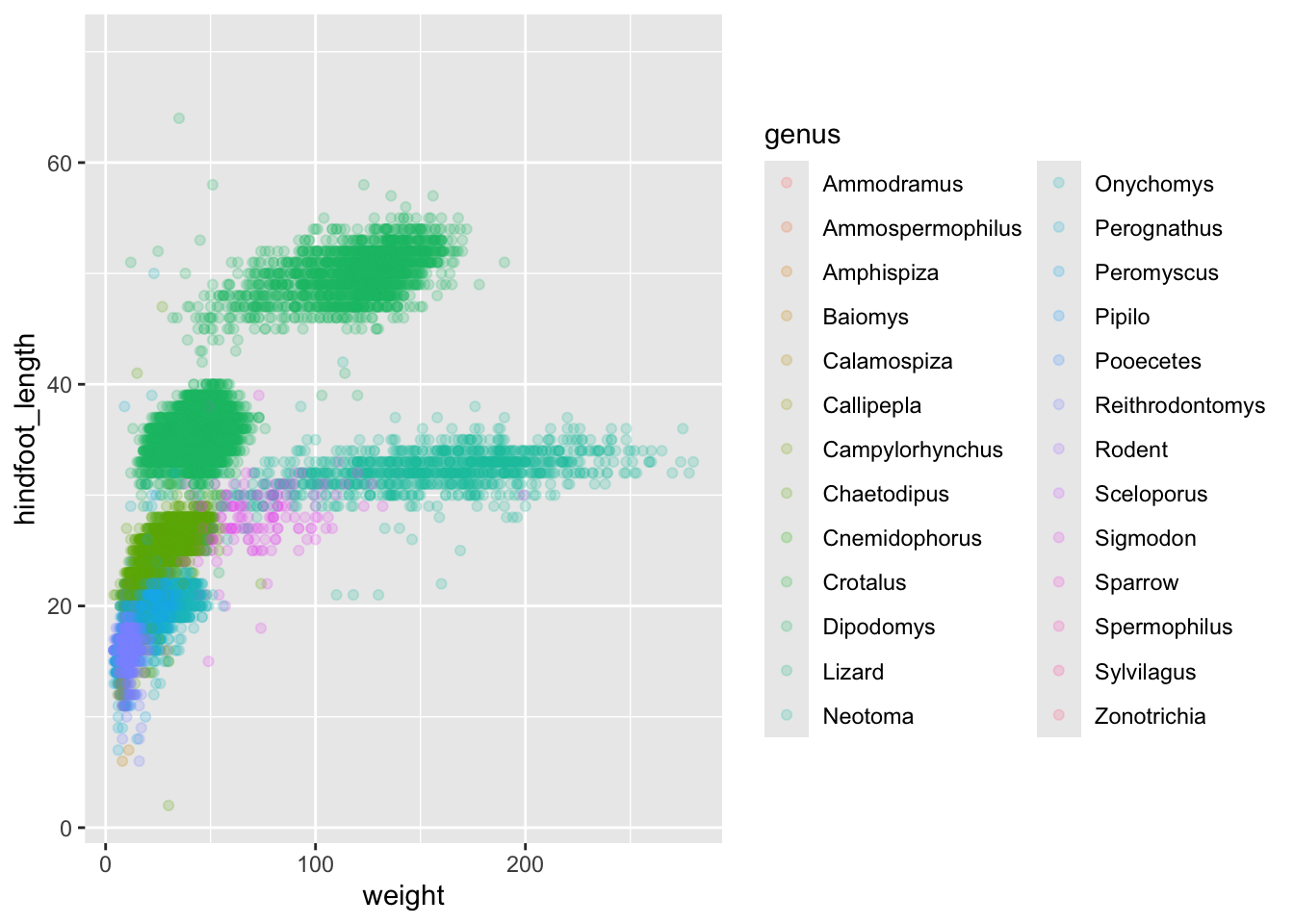 ggplot(aes(x = weight, y = hindfoot_length, colour = genus_species)) +