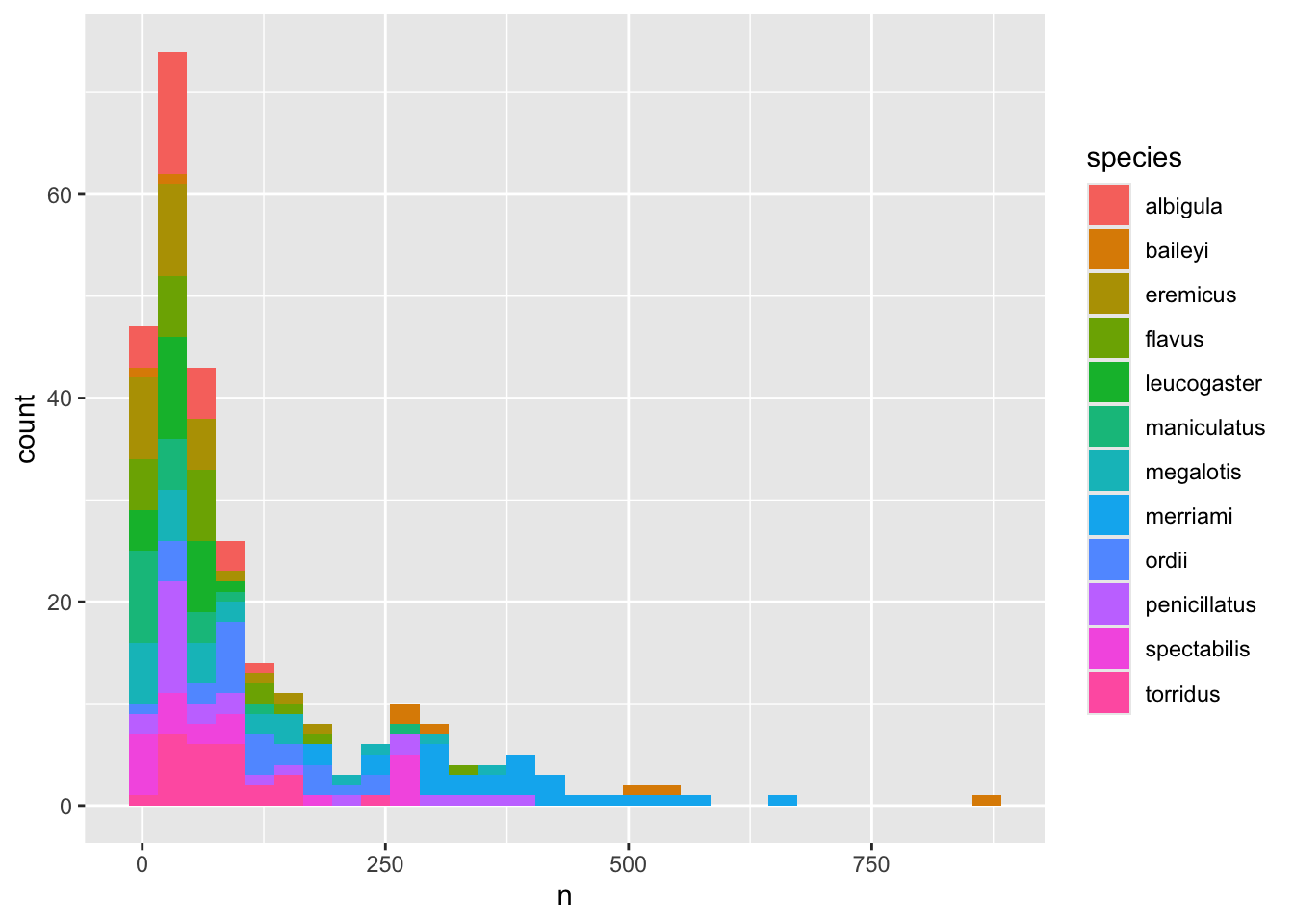 ggplot(aes(x = n, fill = species)) +