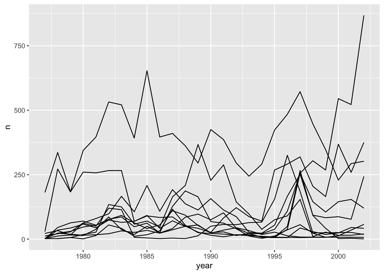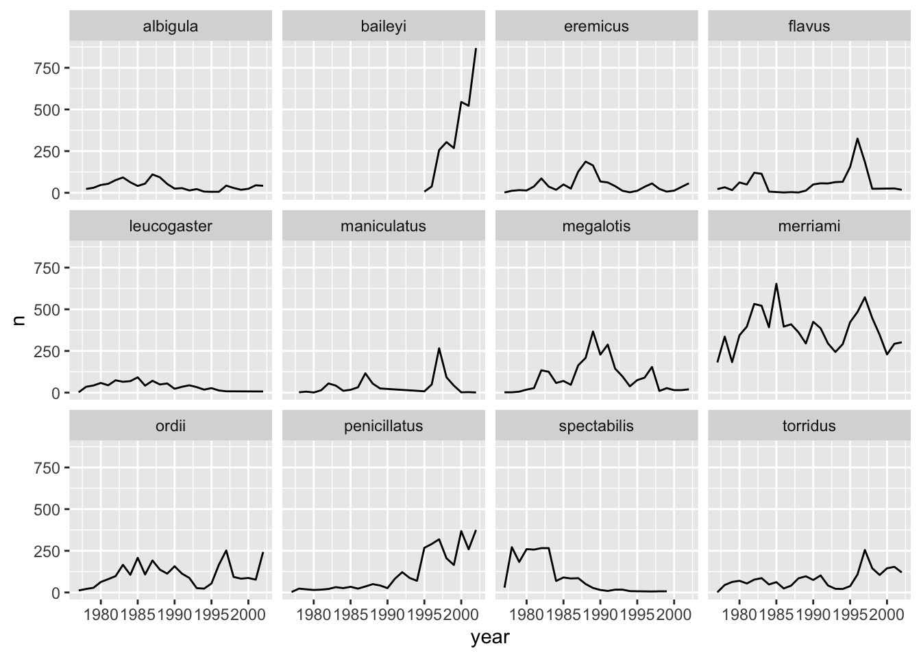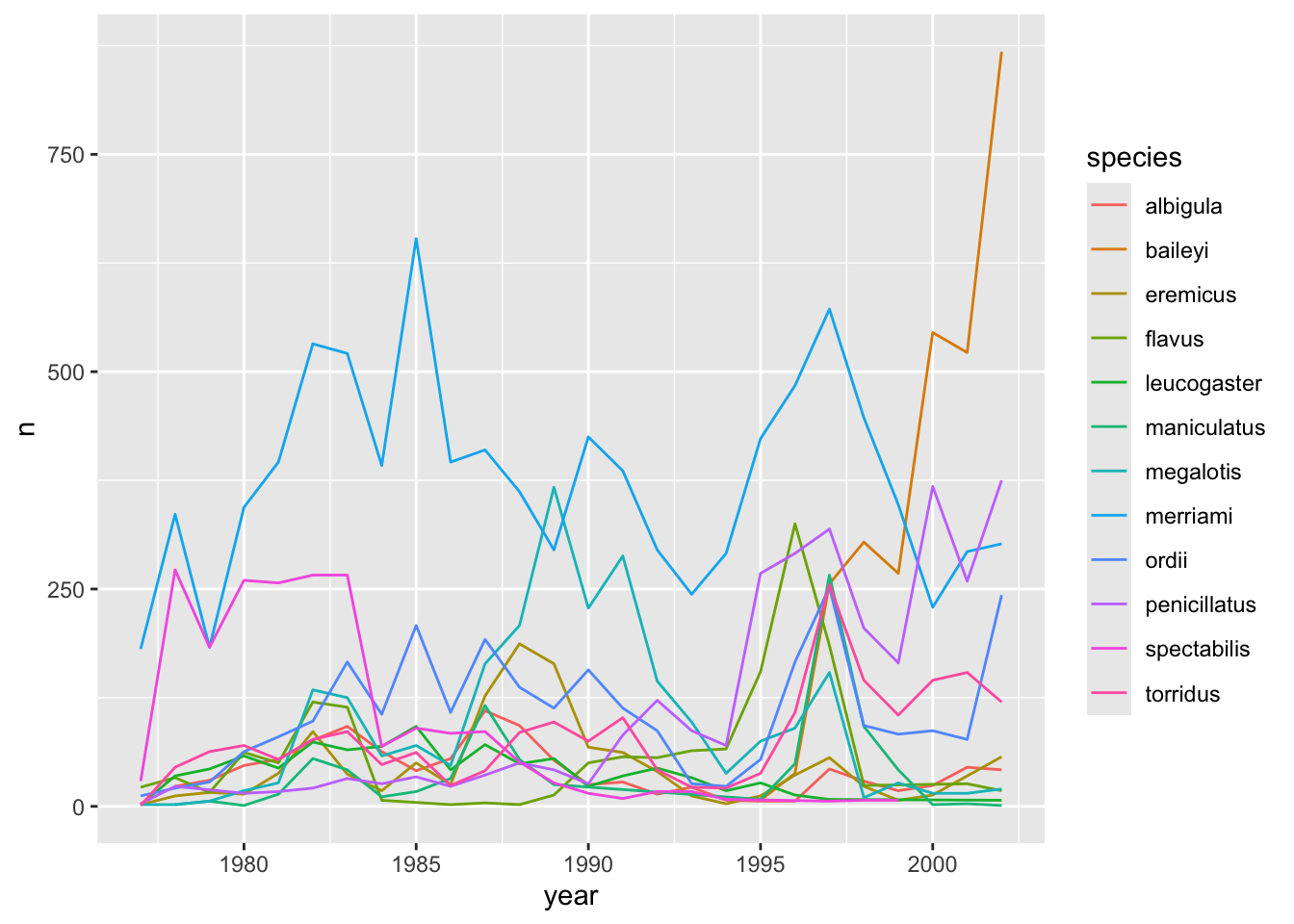 ggplot(aes(x = year, y = n, group = species)) +