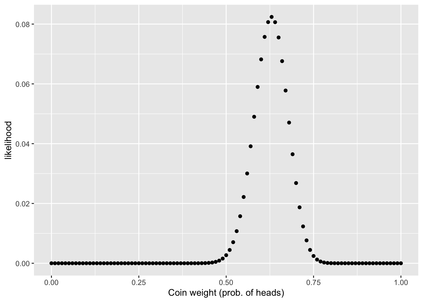 likelihood_vs_coin_weight(63, 100, 0.7)[1] 0.02683446