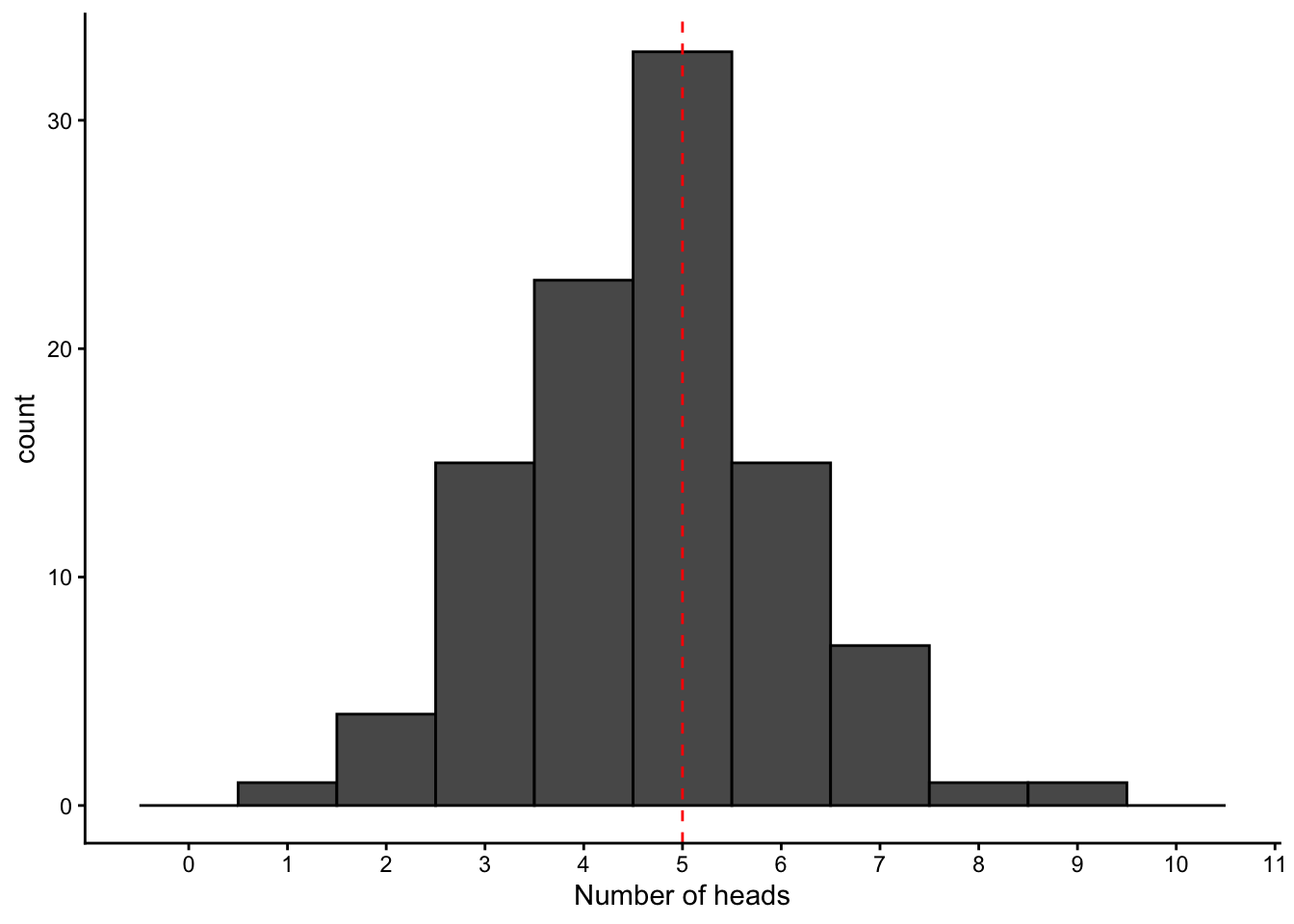 Now, let’s set up a loop to repeat this 10-flip experiment 100 times, and make a plot to see how much the outcomes vary