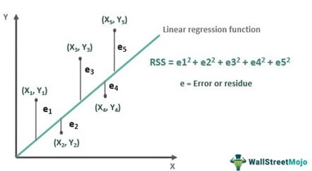 You likely have heard that linear regression chooses the “best fit” line by “minimizing the sum of the squared errors” - that is, the \(\epsilon\) distances the line and the observed data, something like this: