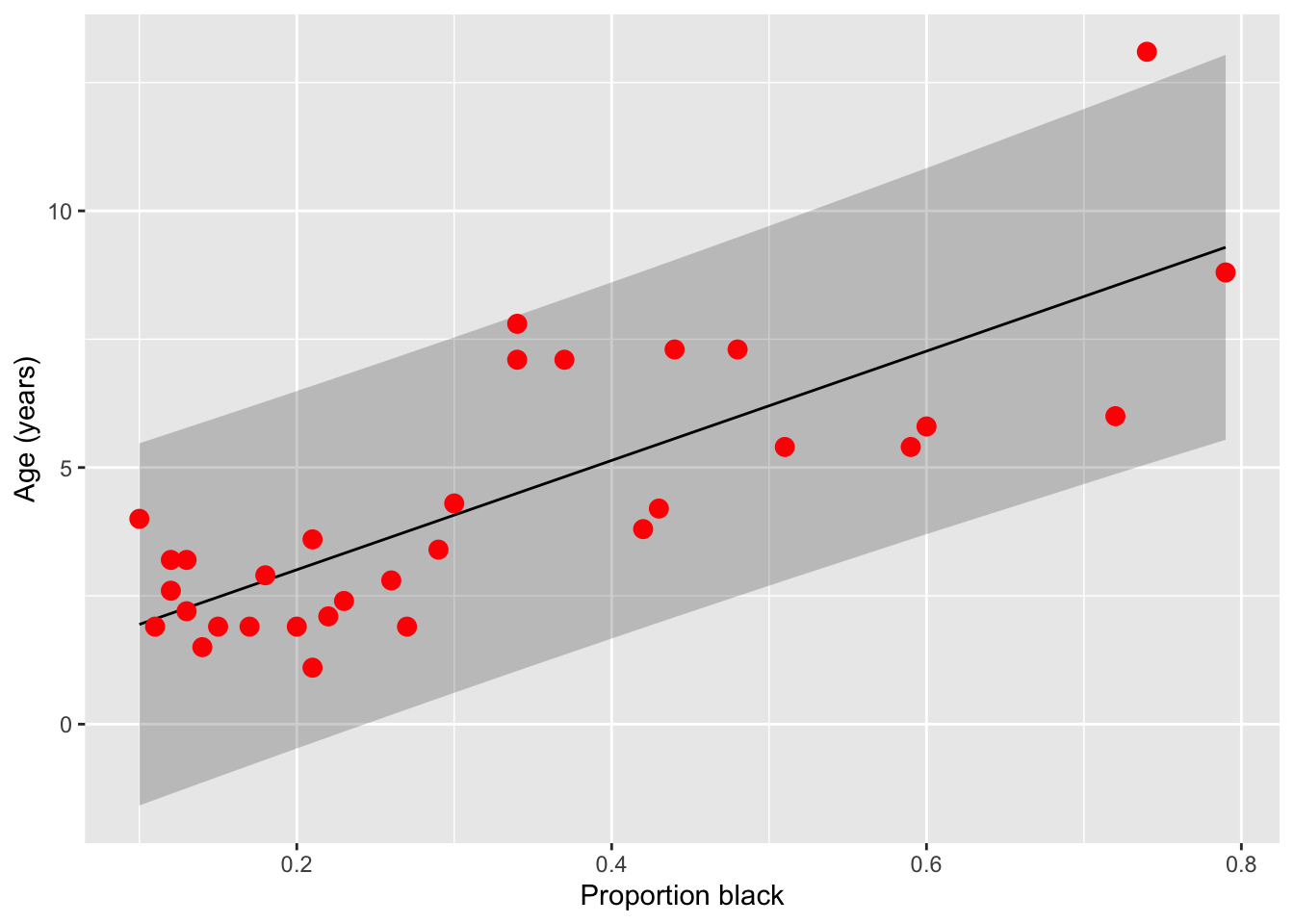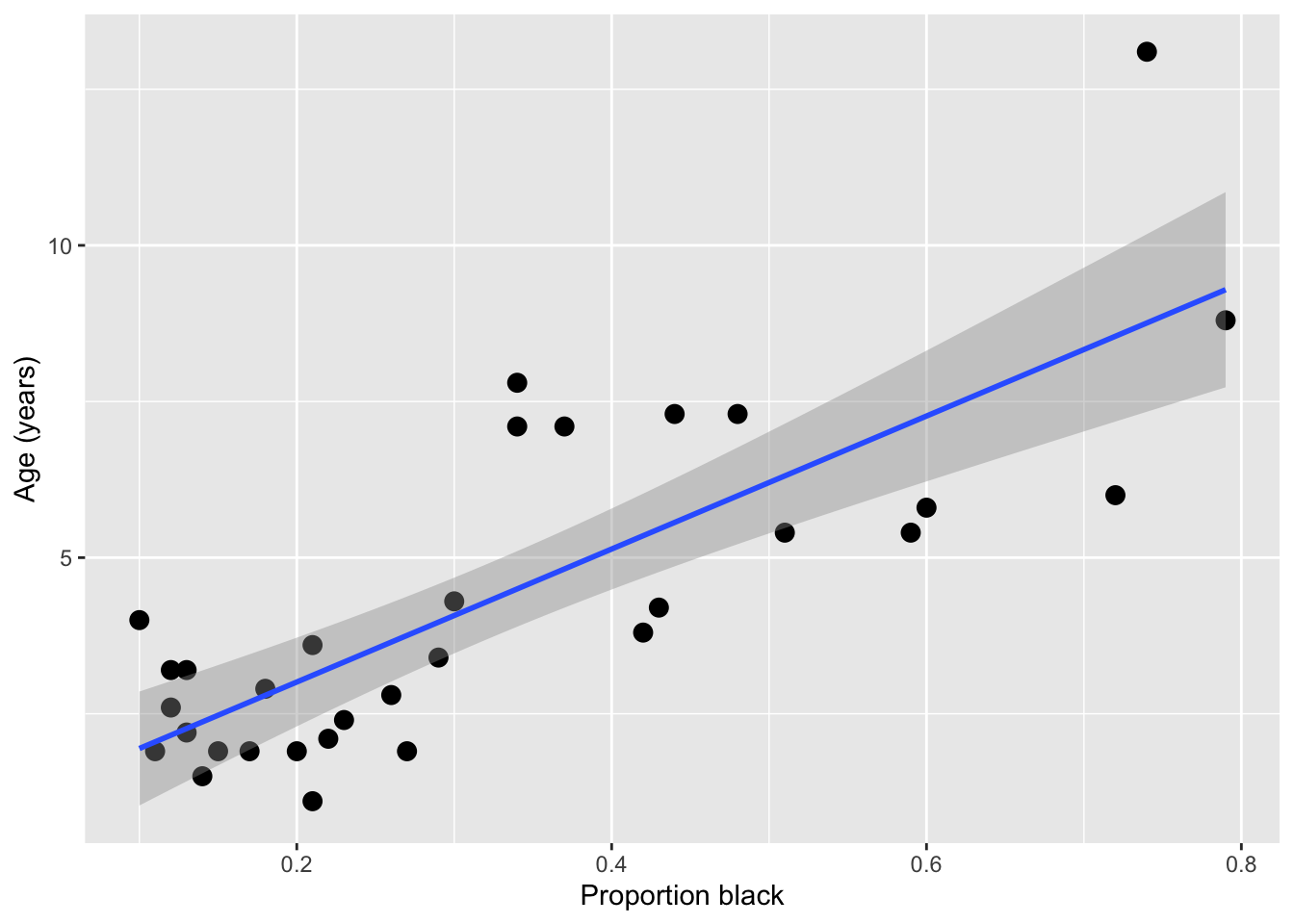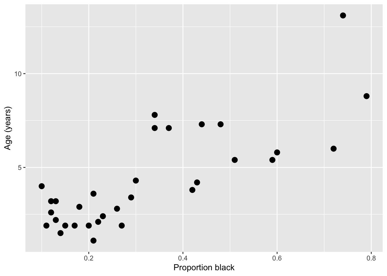 labs(x = "Proportion black", y = "Age (years)")`geom_smooth()` using formula = 'y ~ x'