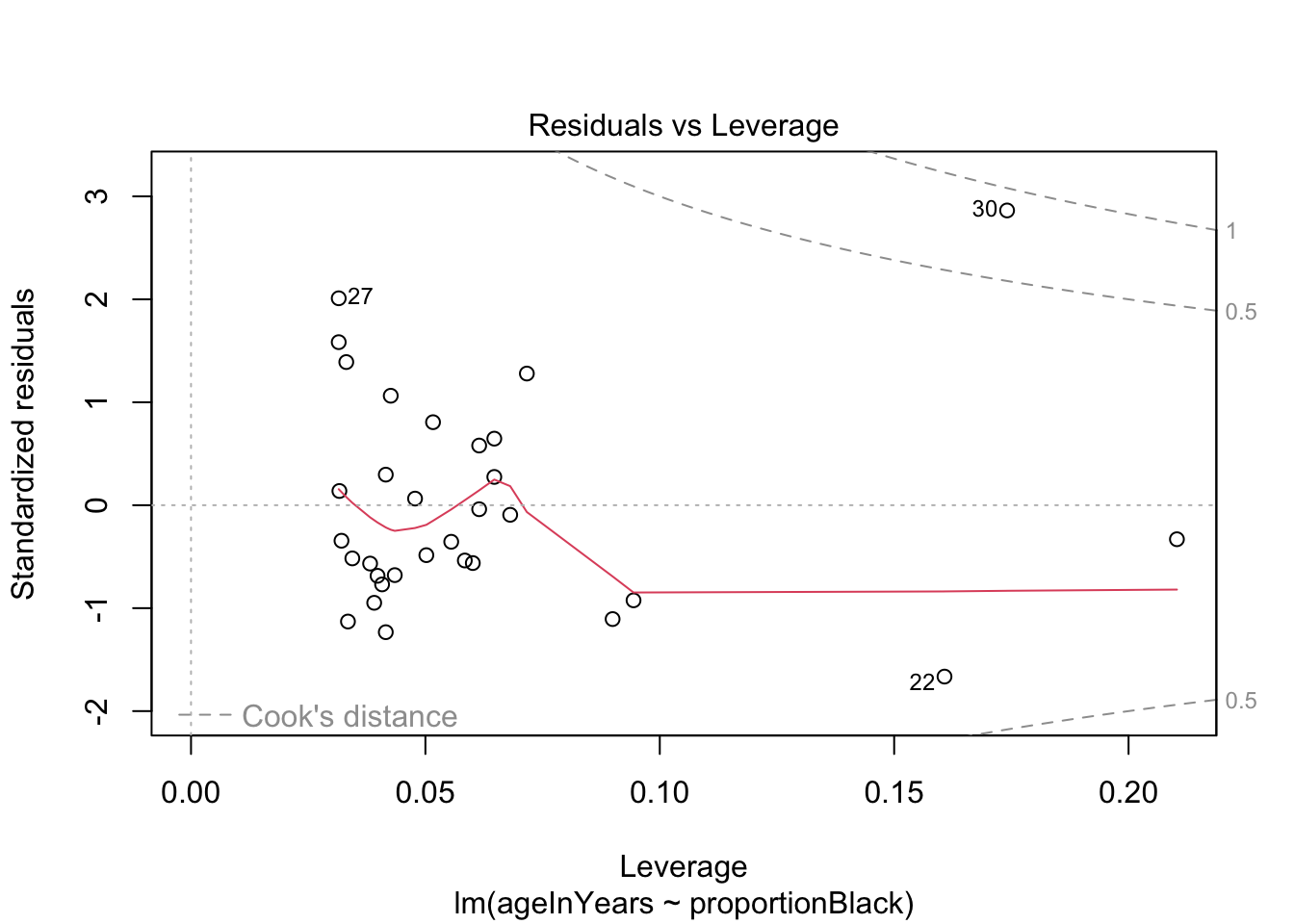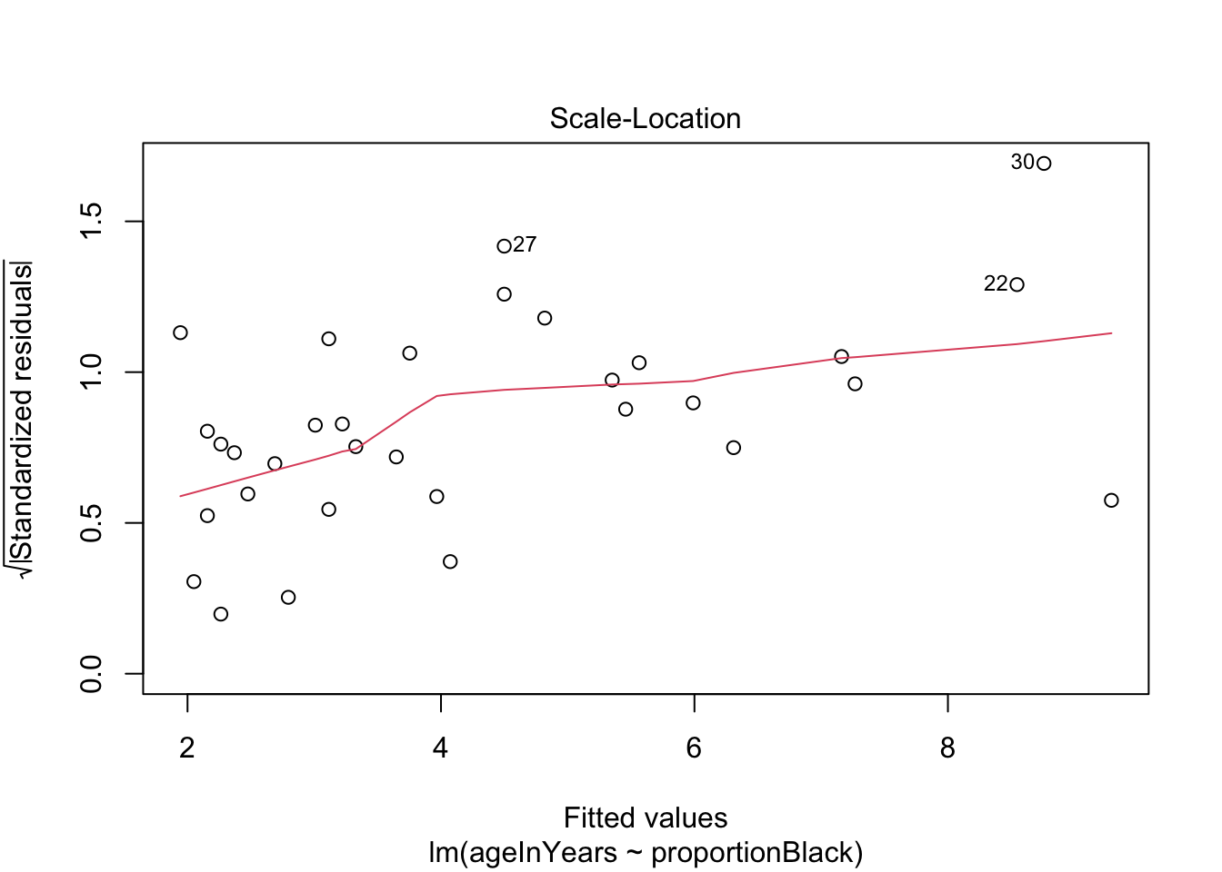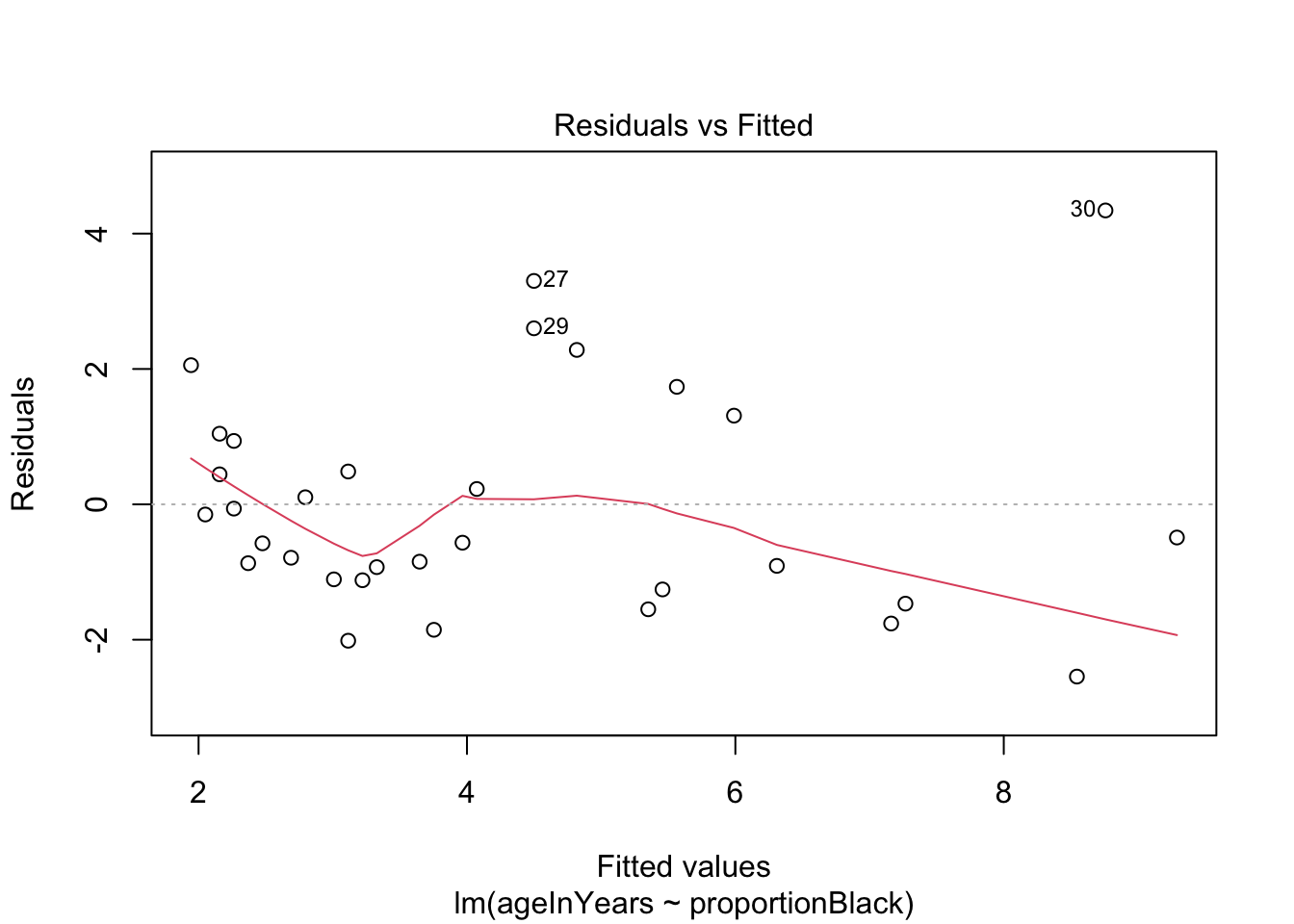 labs(x = "Proportion black", y = "Age (years)")`geom_smooth()` using formula = 'y ~ x'