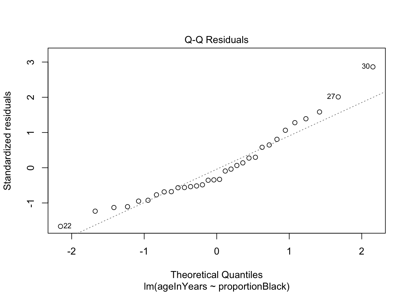 lionFitOutput <- lm(ageInYears ~ proportionBlack, data = lion)We can get a quick look at the output of using the summary() function on it