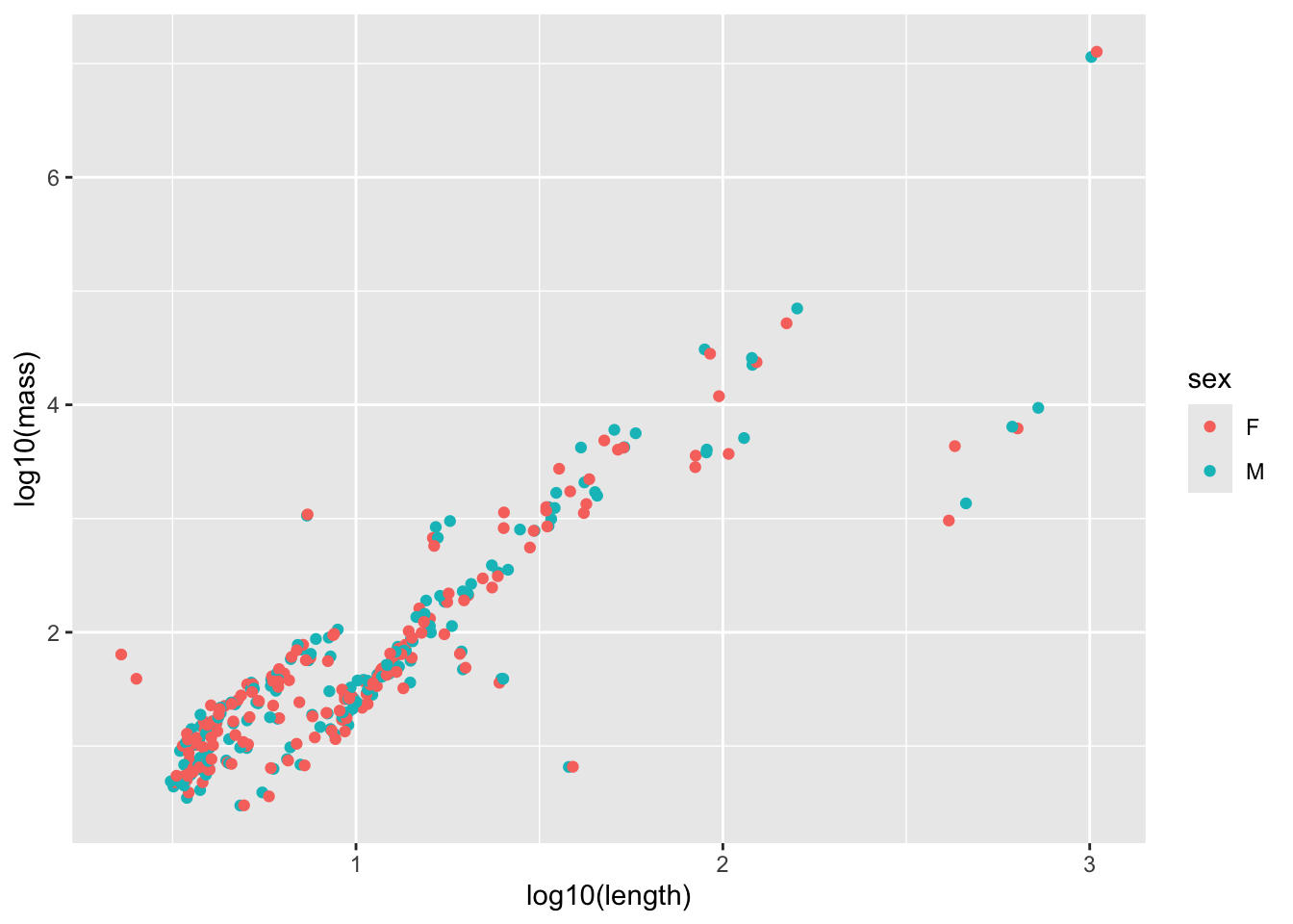 ggplot(aes(x = log10(length), y = log10(mass), color = sex)) +