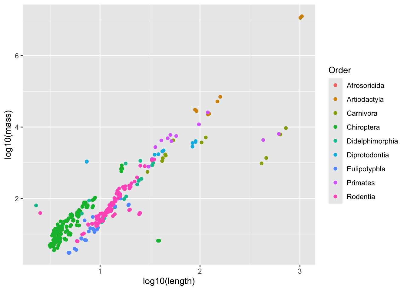 ggplot(aes(x = log10(length), y = log10(mass), color = Order)) +