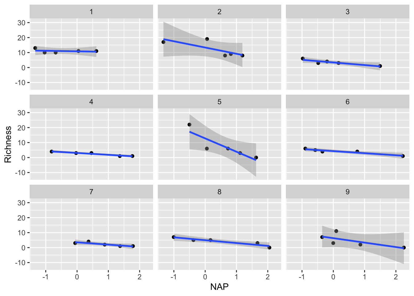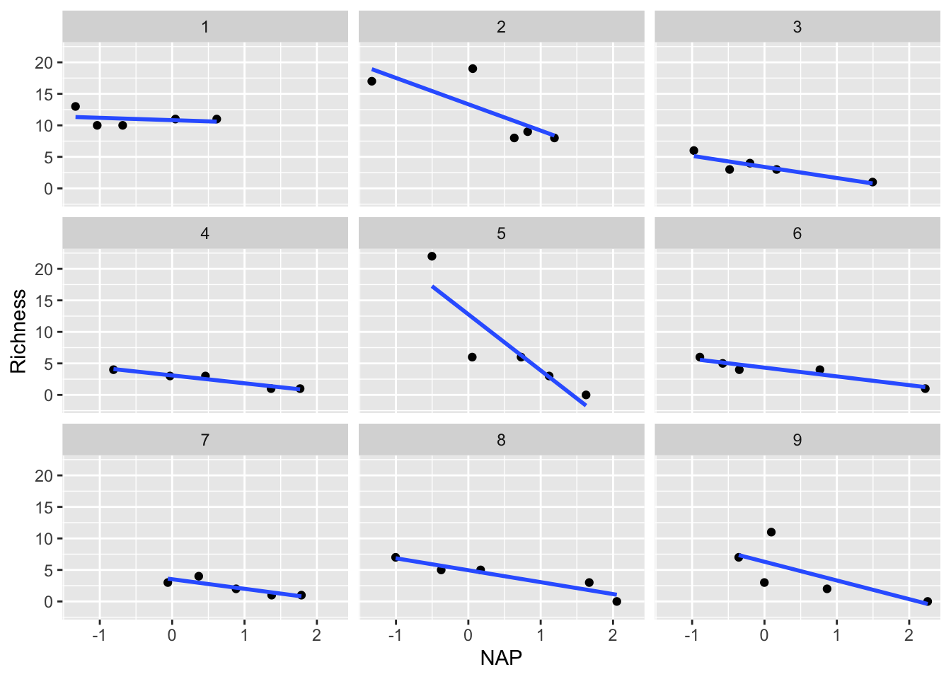 However, this model still makes the assumption that the slope describing the relationship between Richness and NAP is the same for all beaches. Is this really the case? Let’s plot each beach separately to see
