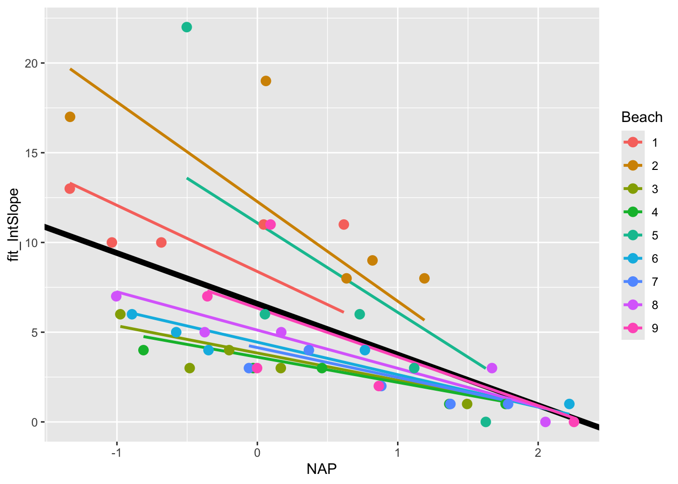 mixed_model_IntSlope <- lmer(Richness ~ NAP + (1 + NAP|Beach),