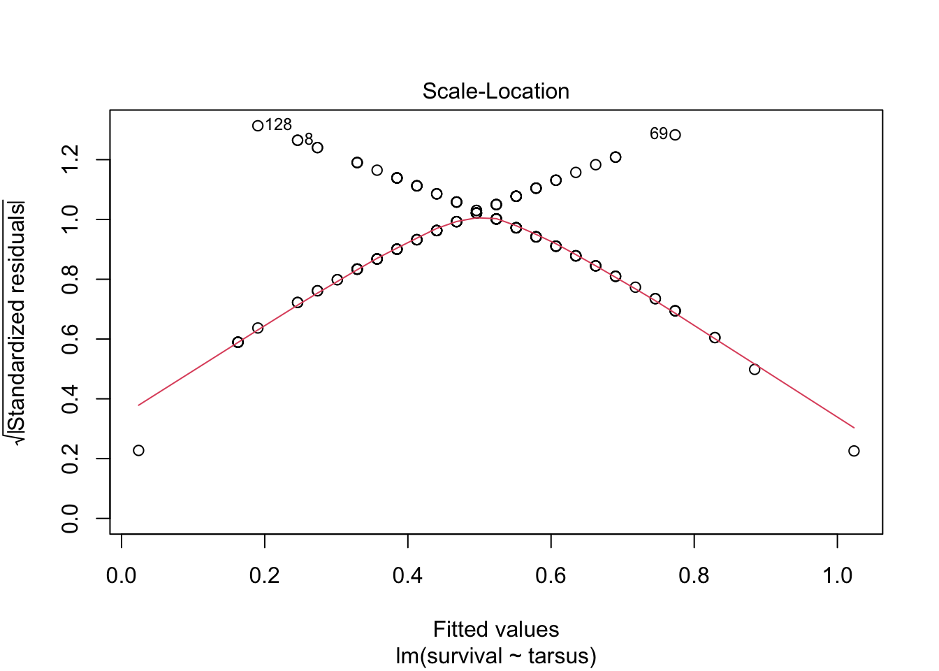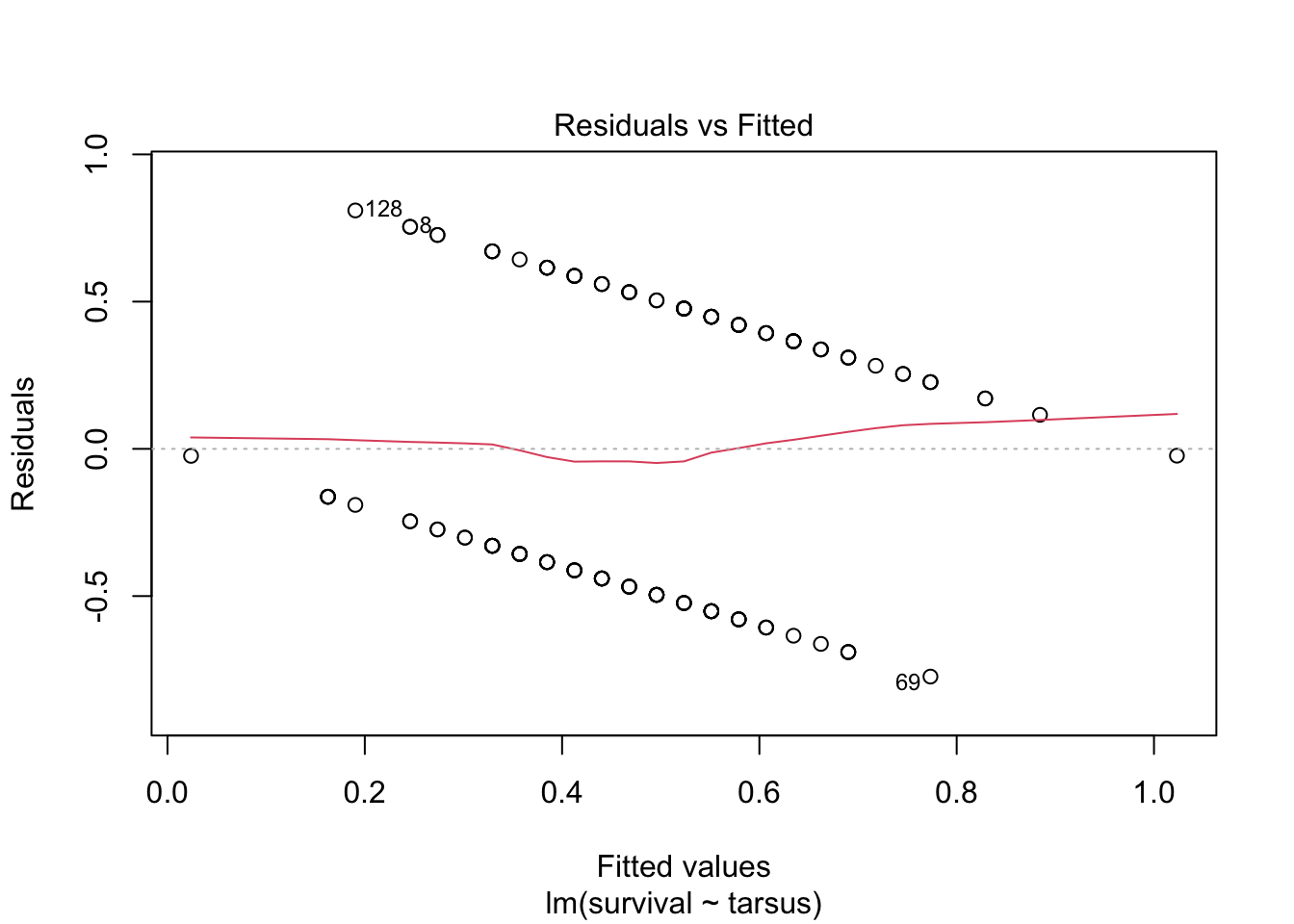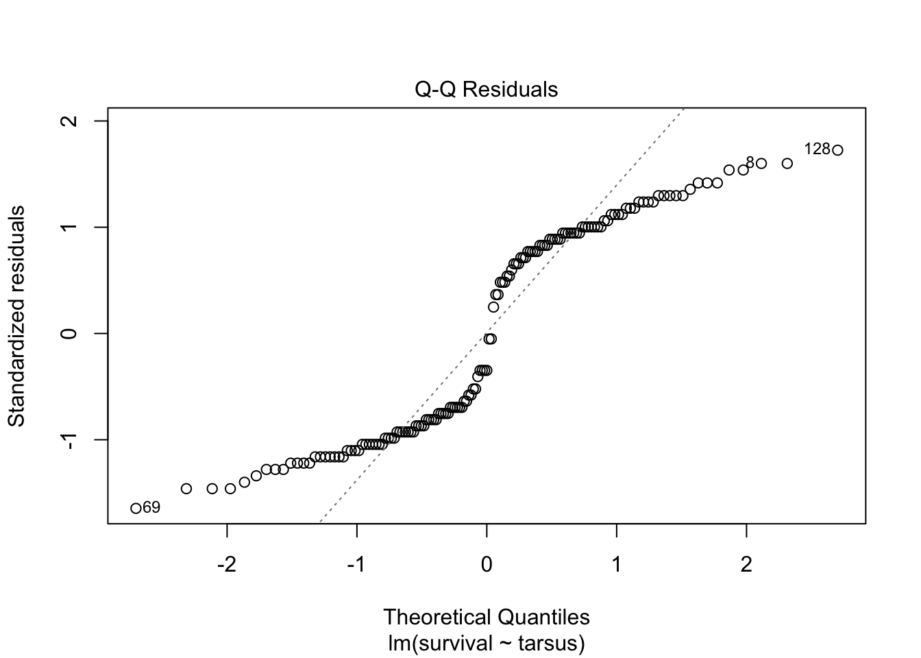 Despite there being a highly-significant relationship between survival and taurus length, it looks like a very small \(R^2\) value. Let’s look at our diagnostic plots: