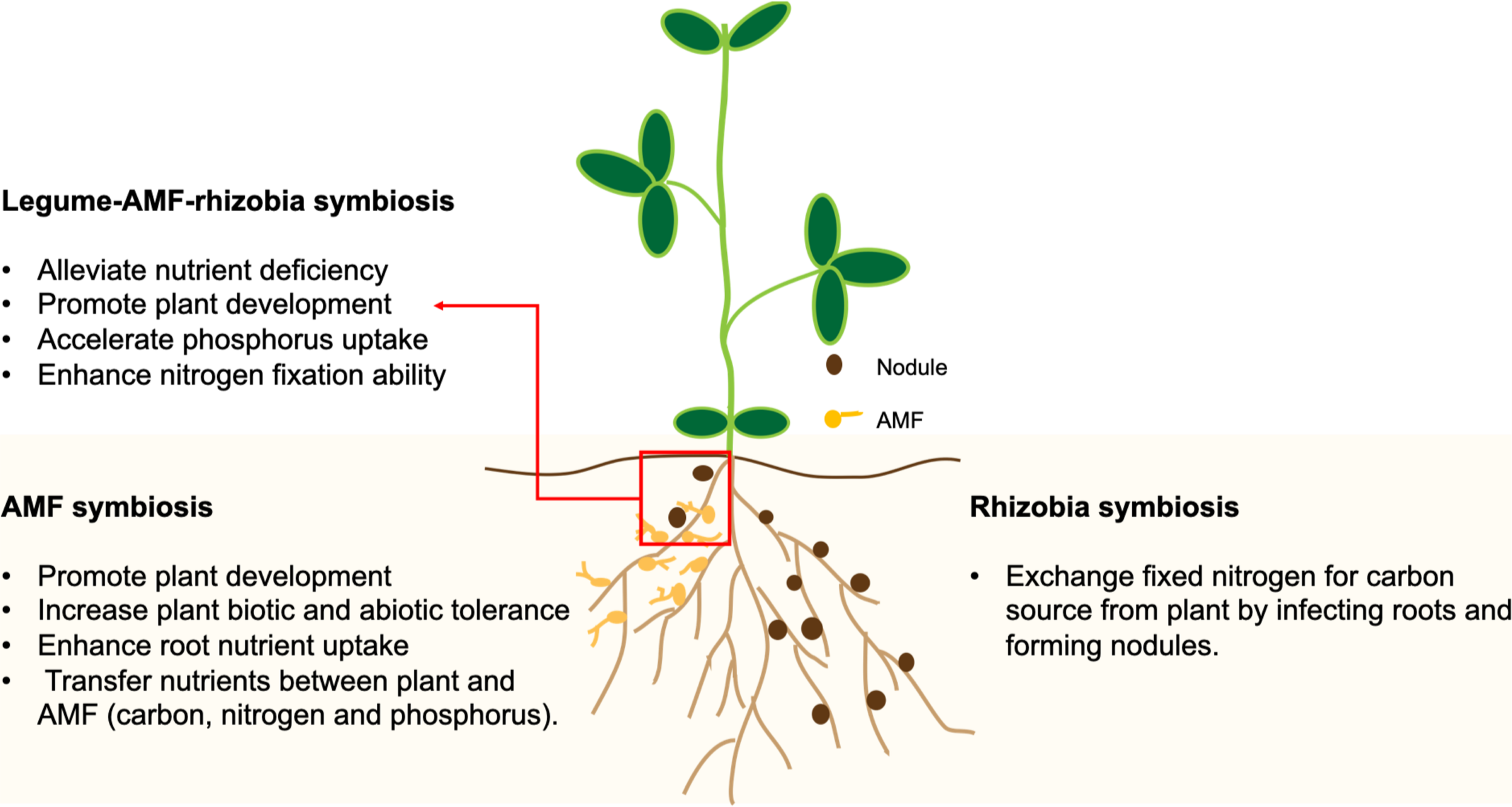 In 2016, Afkhami and Stinchcombe investigated the effects of multiple microbial mutualists on the performance of the model legume, Medicago truncatula. These microbial mutualists offer different rewards to their plant host; rhizobia bacteria provide fixed nitrogen; arbuscular mycorrhizal fungi (AMF) help transfer other nutrients like phosphorus. Rhizobia form structures called “nodules” on the roots of their legume hosts, where they reside and exchange fixed nitrogen for carbon from the plant.