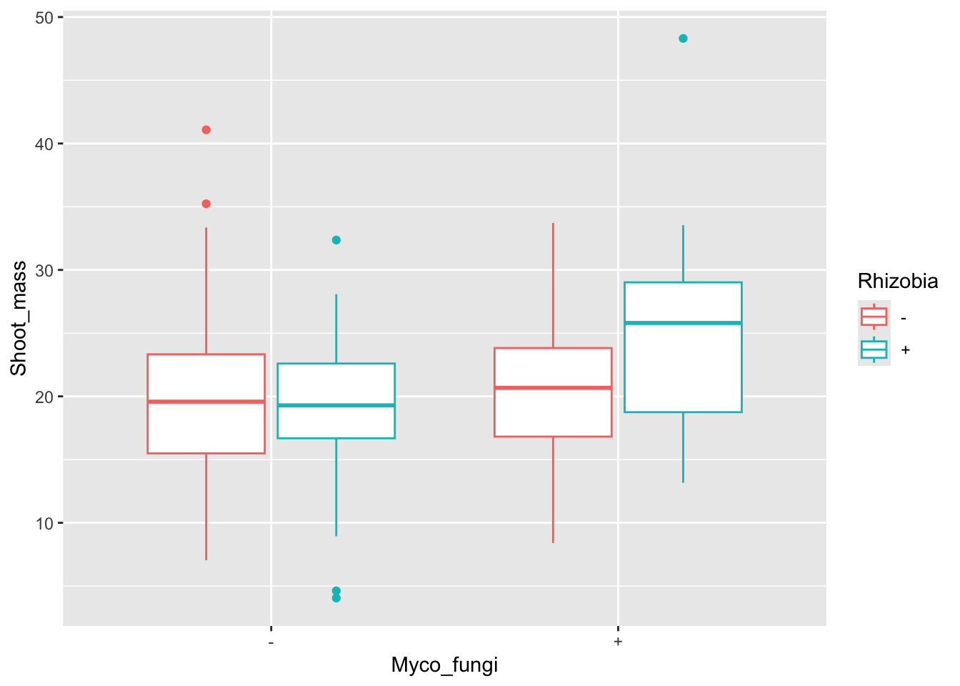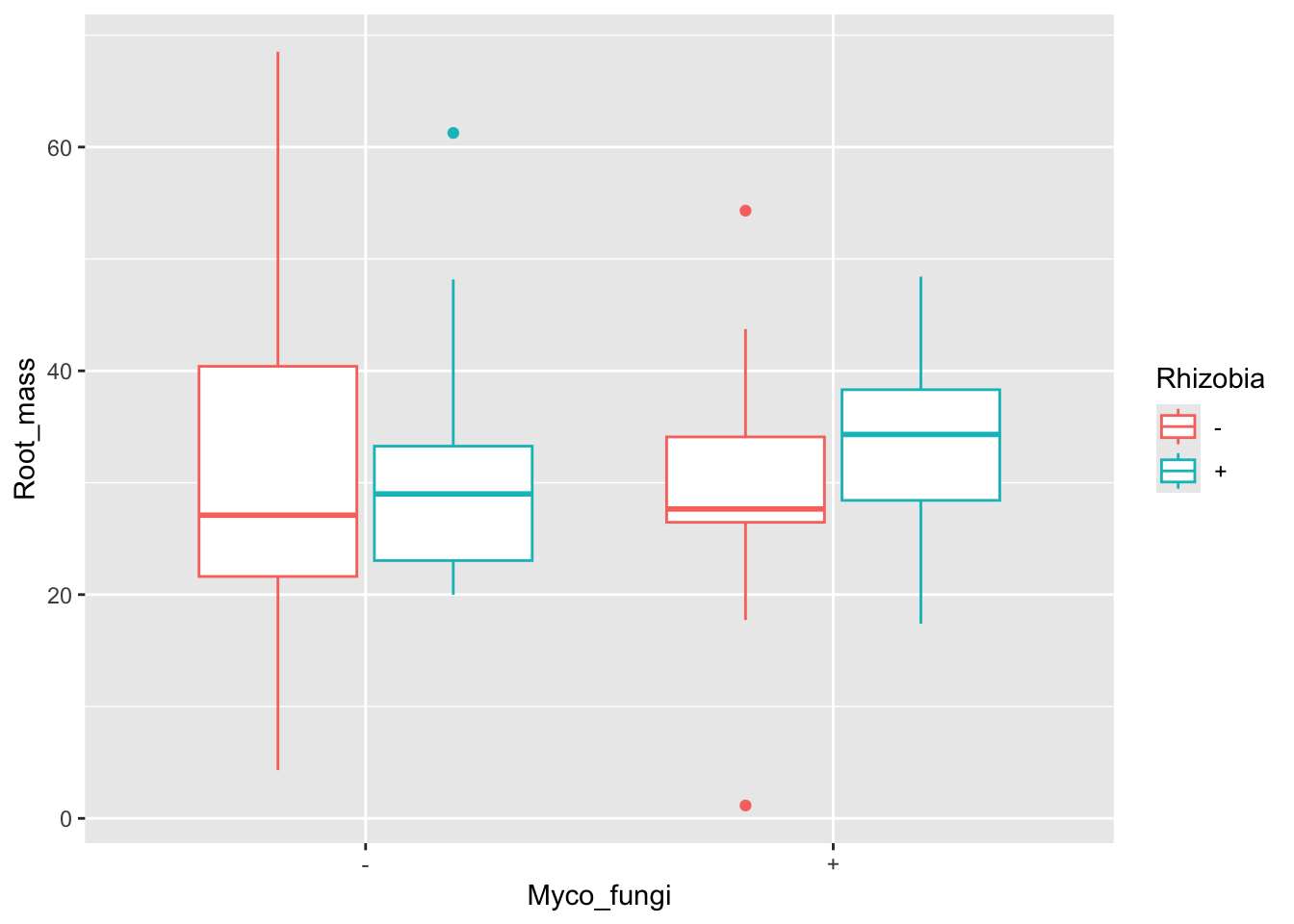 Both rhizobia and mycorrhizal fungi interact with the root structures of their plant host. Rhizobia are housed in nodules, specialized root structures, while mycorrhizal fungi can make filamentous branches, hyphae, on and inside plant roots. Therefore, we could be interested in testing the effects of both microbial partners on belowground (root) biomass. Let’s plot the data!