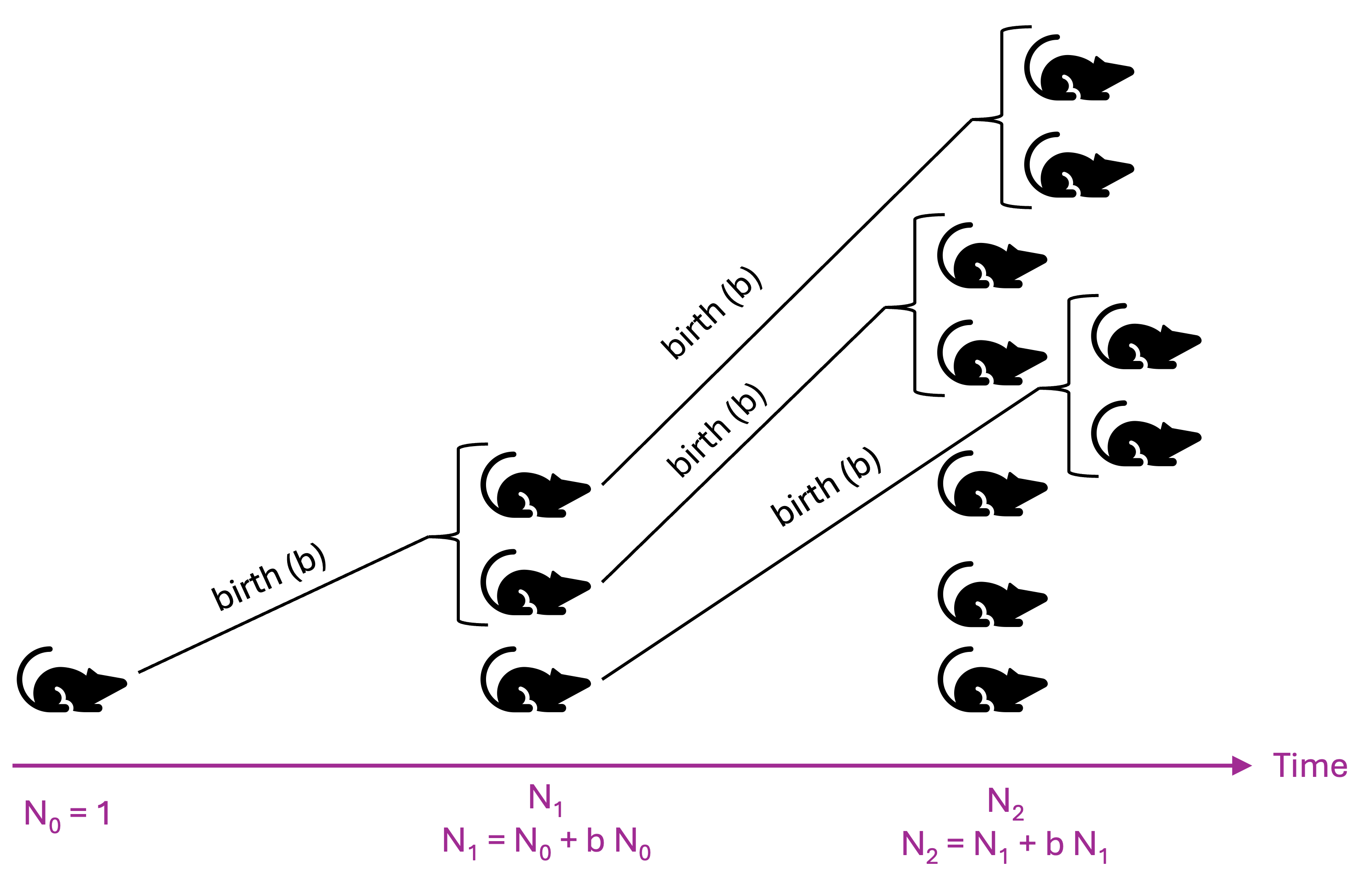 \[N_{1} = (1+b-d) N_0\] \[N_{2} = (1+b-d) N_1 = (1+b-d)(1+b-d) N_0\] \[N_{3} = (1+b-d) N_{2} = (1+b-d) (1+b-d)^2 N_0 = (1+b-d)^3 N_0\]