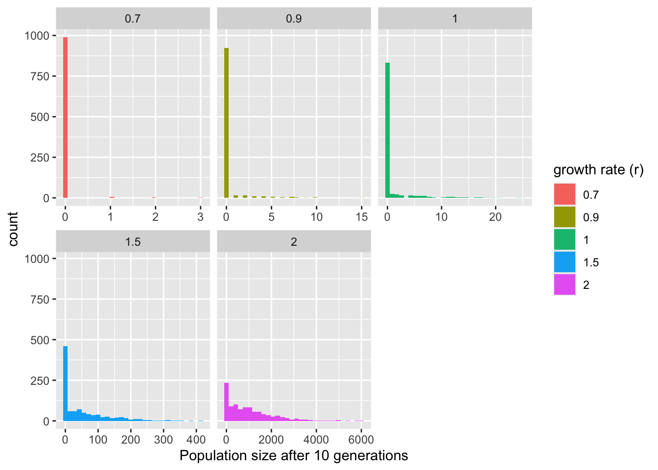 Assume a 1000 new populations are seeded via a migration event with a single individual from a source population (e.g., seed dispersal). We can calculate the distribution of individuals in the second generation, and how it depends on the values of \(r\) (let’s try \(r = 0.7, 1, 1.5, 3, 10\) for now)